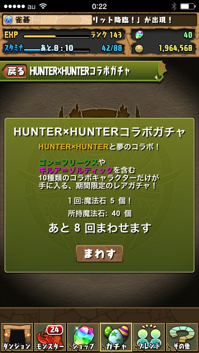 ハンターコラボも我慢できずに回しましたが・・・金はゴン一つだけでした・・・五回じゃそんなものですね。