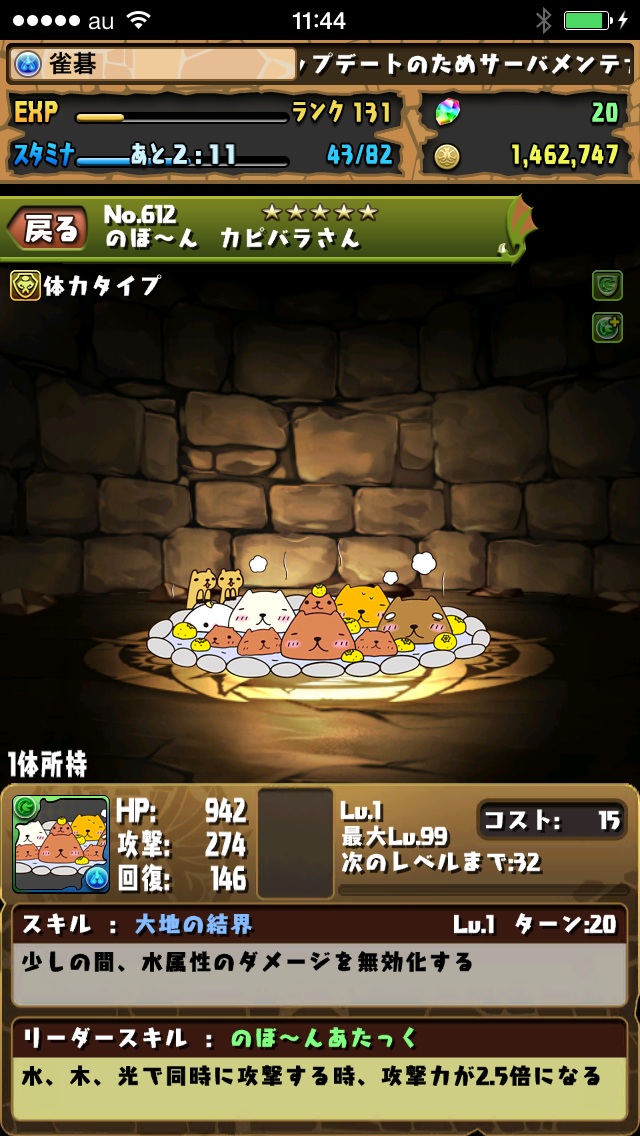 松めぐりして1体だけドロップしたカピバラさんを進化!